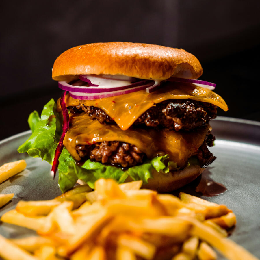 himbo's signature burger! two patties of fourteen FAT ONZES of Juicy marbled beef topped with slices of grass-fed yak cheese, crisp la noscean lettuce, sweet onions, and our secret house sauce served between two FAT buns. comes with a side of sea salt popoto wedges and a cold bottle of. "milk"